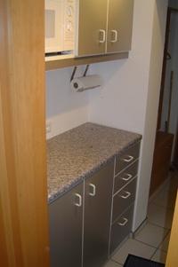 Die Küchenzeile ist 117 cm breit und Deckenhoch. Die Korpen sind aus weiß- und die Türen aus silberbeschichteter Spanplatte mit weißen Kanten. Unterschrank mit zwei Türen und 4 Schubladen. Oberschrank mit integrierter Mikrowelle. Die gesamte Küchenzeile "Vorort" angepasst. Maße: 117 x 245 x 60 cm