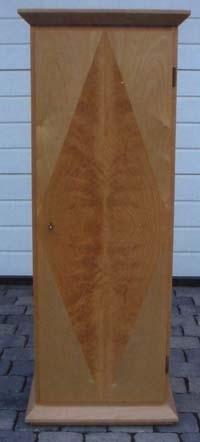 Schrank in Birke furniert. Rautenintasie in Esche. Innenliegender Schubkasten und zwei Einlegeböden. Der Schrank ist transparent mitlackiert. Maße: 50 x 50 x 130 cm