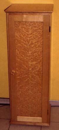 Schrank in Birke furniert. Der Türrahmen ist massiv mit einer Füllung aus Vogelaugenahorn. Innenliegender Schubkasten und zwei Einlegeböden. Der Schrank ist transparent mitlackiert.